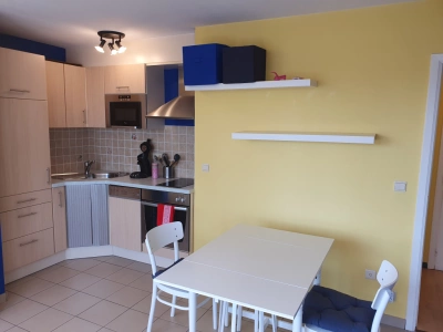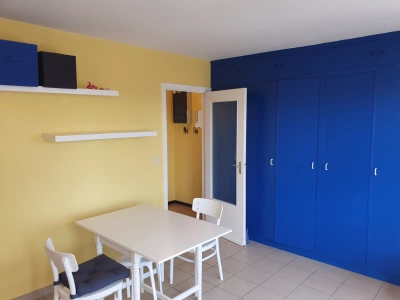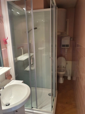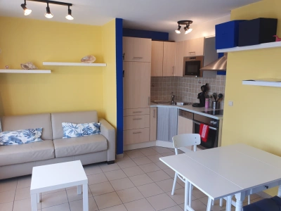 Gezellige studio met zeezicht om de hoek van de zeedijk te Oostduinkerke - Bad. Indeling : lichtrijke leefruimte met open keuken, badkamer met douche , toilet en enkele lavabo . Slaapzetel voor 2 personen en 2 ingebouwde enkele bedden in de leefruimte.