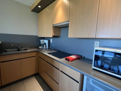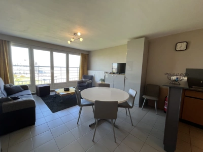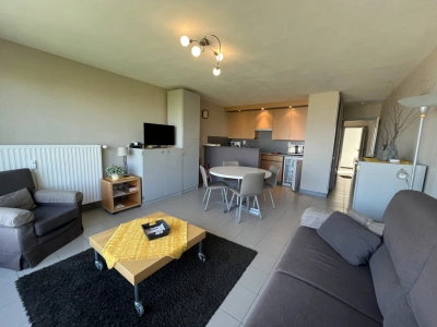 Gezellige studio met zijdelings zeezicht. Bestaat uit woonkamer, aparte keuken, badkamer met douche, zetelbed voor 2 personen en slaaphoek met 2 aparte 1-persoonsbedden. Voorzien voor 4 personen. Roken niet toegelaten.