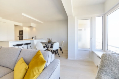 Volledig vernieuwd appartement gelegen op de Wandelpromenade nabij Casino Kursaal op de 4de verdieping bestaande uit een ruime inkomhall met vestiaire en afzonderlijk toilet. Woonkamer met subliem zicht op zee en terras, digitale TV en WIFI, ingerichte keuken met vaatwas, 2 ruime slaapkamers, beiden met een dubbel bed. Beide slaapkamers hebben een badkamer. De een met een inloopdouche en de ander met een inloopdouche en ligbad. Huisdieren en roken verboden.