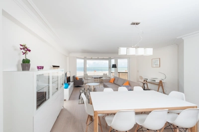 Heel mooi en aangenaam appartement in de Residentie Ocean, gelegen op de wandelpromenade nabij het Casino Kursaal, 2de verdieping bestaande uit een ruime woonkamer met prachtig zicht op zee, balkon vooraan, digitale TV en WIFI, afzonderlijke keuken met vaatwas ..., één badkamer heeft een ligbad, dubbele lavabo en toilet; de 2de badkamer heeft een douche en lavabo, er is nog een afzonderlijk gastentoilet; er zijn 3 slaapkamers waarvan 2 achteraan uitgevend op een zonneterras (2 dubbele bedden en stapelbedden). Garagebox in de Residentie inbegrepen. Huisdieren en roken verboden.