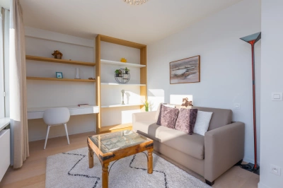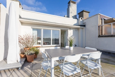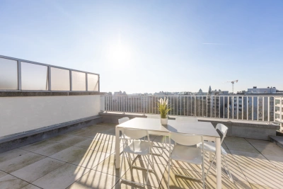 Deze penthouse bevindt zich op de 6e en 7e verdieping van de prestigieuze residentie Zonneschijn. Deze prachtige duplex is volledig gerenoveerd met hoogwaardige materialen, waarbij speciale aandacht is besteed aan ruimte en licht. Op de 6e verdieping vindt u een royale woonkamer, een open en volledig uitgeruste keuken, een aparte berging, een garderobe met een apart toilet, en een ruime slaapkamer met een badkamer voorzien van een ligbad, een inloopdouche en een dubbele wastafel. Op de 7e verdieping, toegankelijk via zowel de lift als de binnentrap, bevinden zich twee ruime slaapkamers, een doucheruimte, een apart toilet en een fantastisch zonneterras met uitzicht op het Stefanieplein.