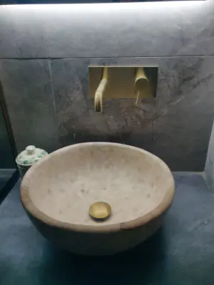 Badkamer met inloopdouche, wastafelmeubel met wastafel.