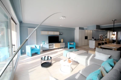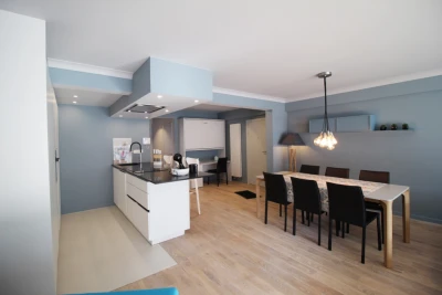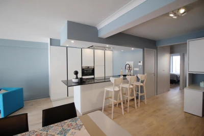 Prachtig appartement met 2 slaapkamers op de 3e verdieping volledig gerenoveerd met smaak. Het appartement biedt plaats aan 4 tot 5 personen. Grote woonkamer van 50m2 met volledig uitgeruste open keuken, 2 slaapkamers, bedden voor 2 personen met elk een eigen badkamer. Box garage aan de voorzijde van het gebouw inbegrepen in de prijs. Wifi. Kleine hond toegestaan op voorwaarde. Rookvrij appartement.
