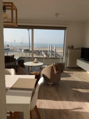 Gelegen op de dijk, hoek appartement Zuid/Zuid West, zeer helder met prachtig zeezicht. In de hedendaagse stijl van de Noordzee werd door interieur ontwerper gerenoveerd. Samengesteld uit 3 kamers voor 2 personen, 1 keuken met afwasmachine, 1 klassieke + 1 magnetron.
