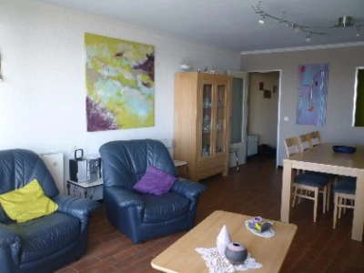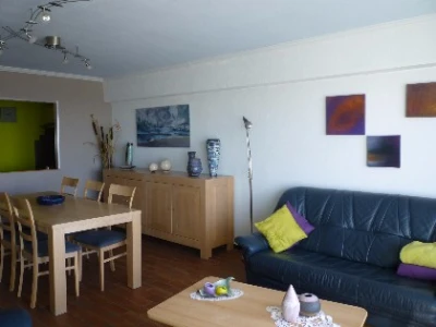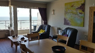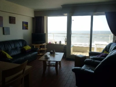 Logiedecreet nr 230266. In Middelkerke, Residentie Golden Beach, Zeedijk 25L8. Gezellig, ruim leef 2 slaapkamer appartement van 85m² voor 6 personen, voorzien van alle comfort.  8Ste verdiep, 2 liften, traphal. Terras vooraan met  frontaal zeezicht, en achteraan met vrij zicht op het Hinterland. Het appartementsgebouw heeft een ingang voor en achteraan, waar ook  parkeerplaatsen beschikbaar zijn (Middelkerke heeft een parkingbeleid). Wij hebben ook een privé staanplaats achter gesloten poort aan het appartement. Inkom, gang, vestiaire, sas, aparte wc. Leefruimte met eetplaats, zithoek 1-1-en slaapzetel voor 2 personen, salontafel, TV flat screen en gratis WIFI. Overal waar men zit heeft men een fantastisch zicht op zee. Schuifraam naar terras met tafel en 6 stoelen. Gezonde zeelucht, rustgevende golfslag, heerlijk  profiteren van een zachte zeebries of ’s avonds genieten van de warme gloed van een ondergaande zon. Half open ingerichte keuken; keramische kookplaat, dampkap, combi- en microgolfoven, koelkast met vriesvakje, vaatwasmachine, koffiezet, Senseo, waterkoker, eetservice voor 8 personen……alle comfort voor een lang verblijf.