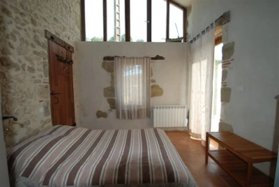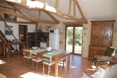 Dit huisje, blootgesteld aan het Zuid-Oosten, is zeer licht dankzij de grote foto-venster van het verblijf. Het ontstond in de voormalige tabak droger. Alle de stenen zijn duidelijk; bundel van boerderijen, houtwerk van de planning en de openingen worden in het oude hart van eiken zorgvuldig schoongemaakt.